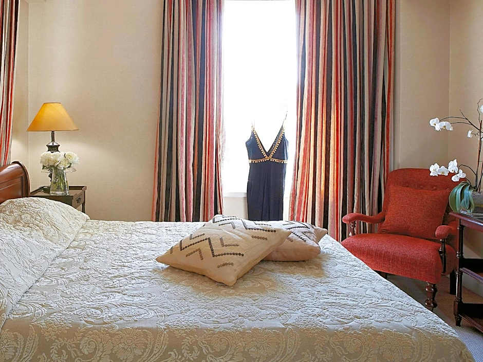 Spacious, luxurious suite with classical style, earthy colors, silk textiles and handmade furnishings. Features a king size bed, 2 TV sets with satellite channels, marble bathroom with big bathtub and luxurious amenities. Please note that 3 of these junior suites come with an extra guest powder room. Connecting units are available to create a 2-bedroom suite.